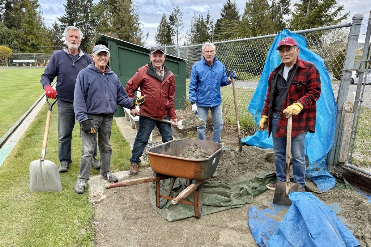 It took a while, but the sandbox is done and on Monday April 13th, the crew moved the sand back into the box. We even had a little help from a former member of the Club. Joe Randazzo, now a member of the Courtenay Lawn Bowling Club, dropped by for a visit with the Monday morning crew. Watching the rest of the group haul wheel barrow after wheel barrow of sand to the new box, Joe offered to move a few loads of the sand for us. What a guy, and greatly appreciated.